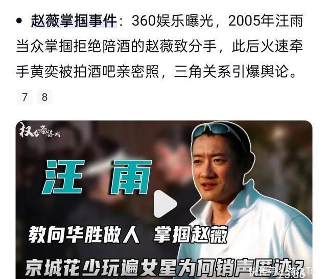 网友虽然说的是比较玄的面相学,但并不是没有道理的,之前汪雨和赵薇谈恋爱的时候,就闹出过“掌掴赵薇”的新闻。 打人的原因只是因为赵薇拒绝陪酒,所以他就当众打了对方,随后就把赵薇甩了,火速和另一位“小燕子”黄奕在一起了。